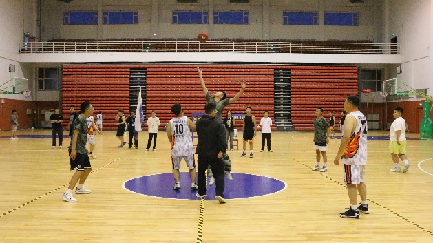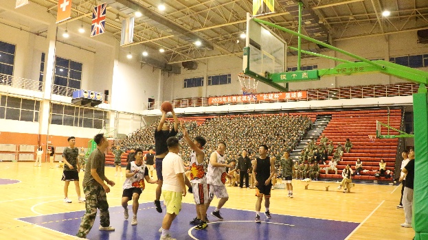 球场上,双方队员迅速进入状态,运球、传球、投篮……动作行云流水,配合默契十足。大一新生队员们虽脸庞稚嫩,但眼神坚定,每一次拼抢、每一次回防都展现出不服输的劲头;国防聚志训练团的教官们则凭借丰富的经验和出色的体能,打出了许多精妙的战术配合。赛场边,观众席气氛热烈,军训新生们组成的啦啦队呐喊声、助威声此起彼伏,为秋日的校园增添了无限的活力与激情。