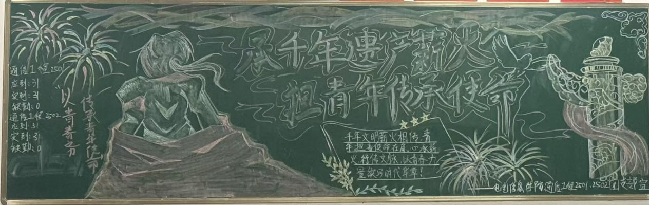 为充分发挥黑板报育人功能,营造积极向上的校园文化氛围,培养学生的创新精神与传承意识,10月29日19时,我院于各班级教室成功开展了以“承千年遗产薪火 担青年传承使命”为主题的第三期板报评比活动,24级、25级全体班级参与。