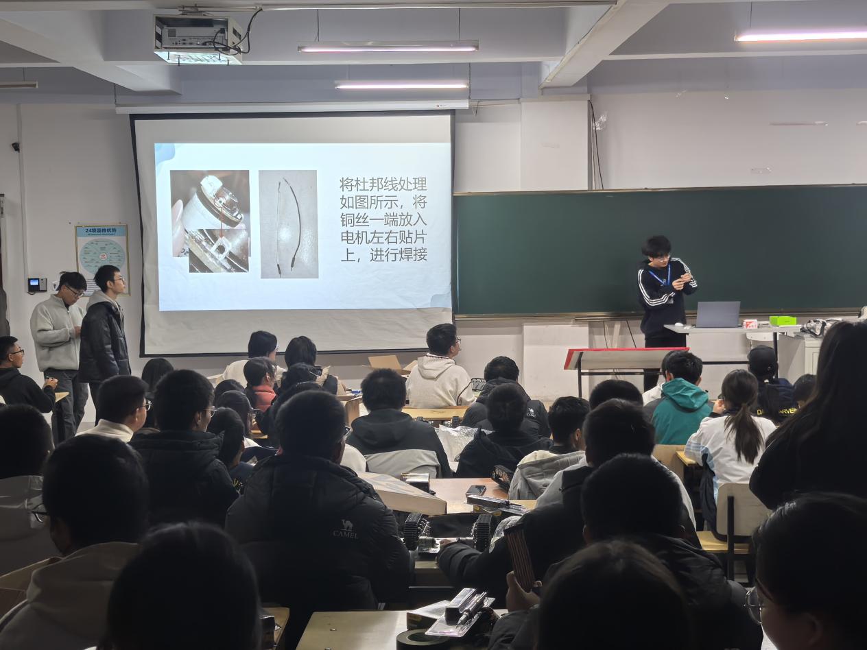 在随后的实操环节,同学们分组进行焊接练习,协会成员巡回指导,一对一纠正烙铁握持姿势、焊锡方法等问题,确保每位同学都能熟练掌握电机与开关的焊接技巧。此外,协会还在新生群中同步分享演示视频,多方位保障学习效果。整场活动氛围专注而融洽,展现了良好的协作与研学风气。