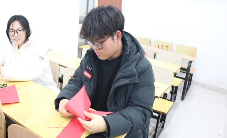 实践环节,宣传部工作人员现场示范了“斜对折、中线对折、画样、裁剪”等基础技法。参与者们或凝神构思,或巧手折叠,将对称美学与几何思维巧妙融合。尽管多数同学首次接触剪纸,但凭借扎实的空间想象能力,不一会儿,一幅幅生动的图案便跃然纸上。红纸翻飞间,展现出了细腻的人文情怀与艺术创造力。