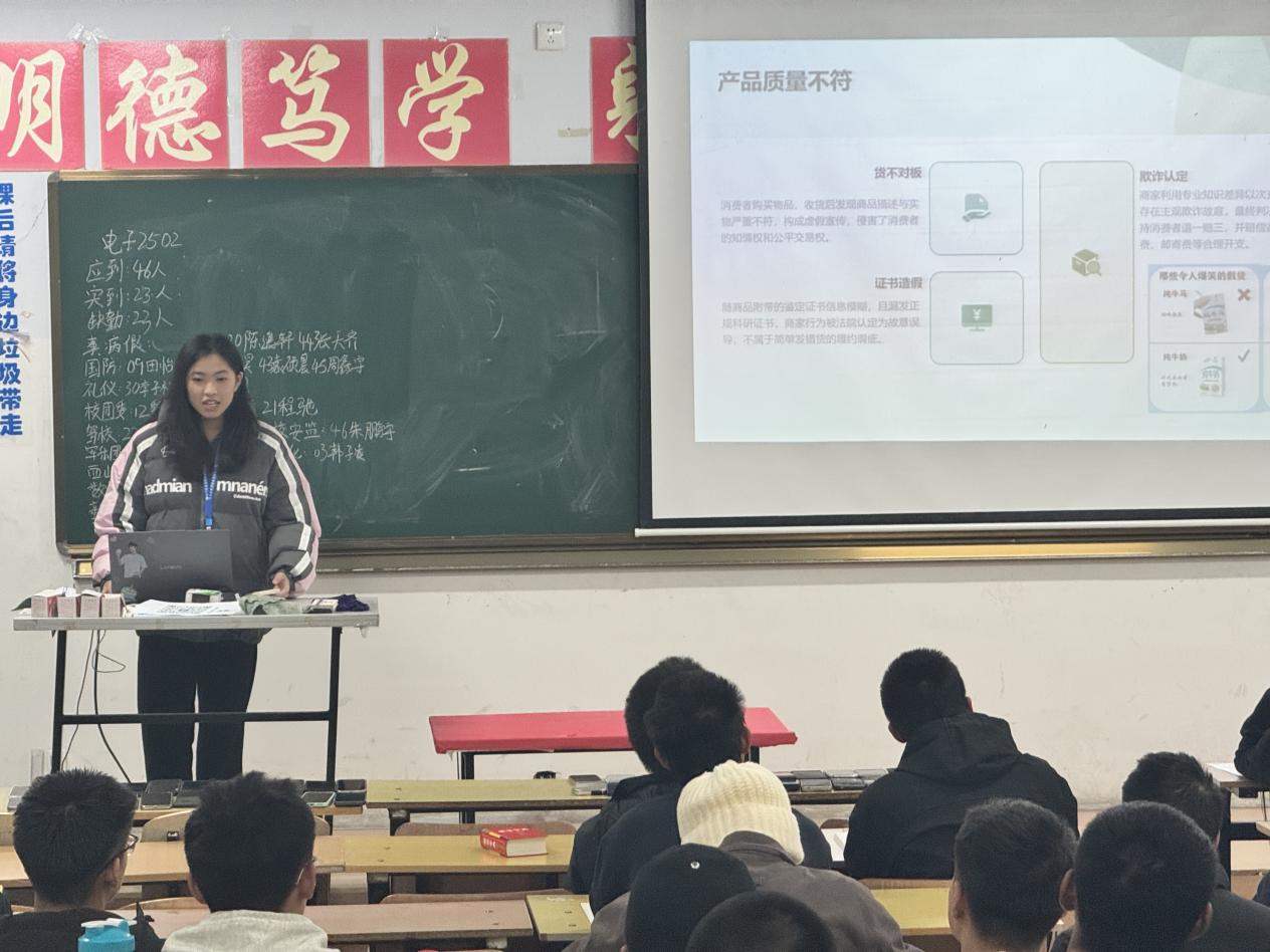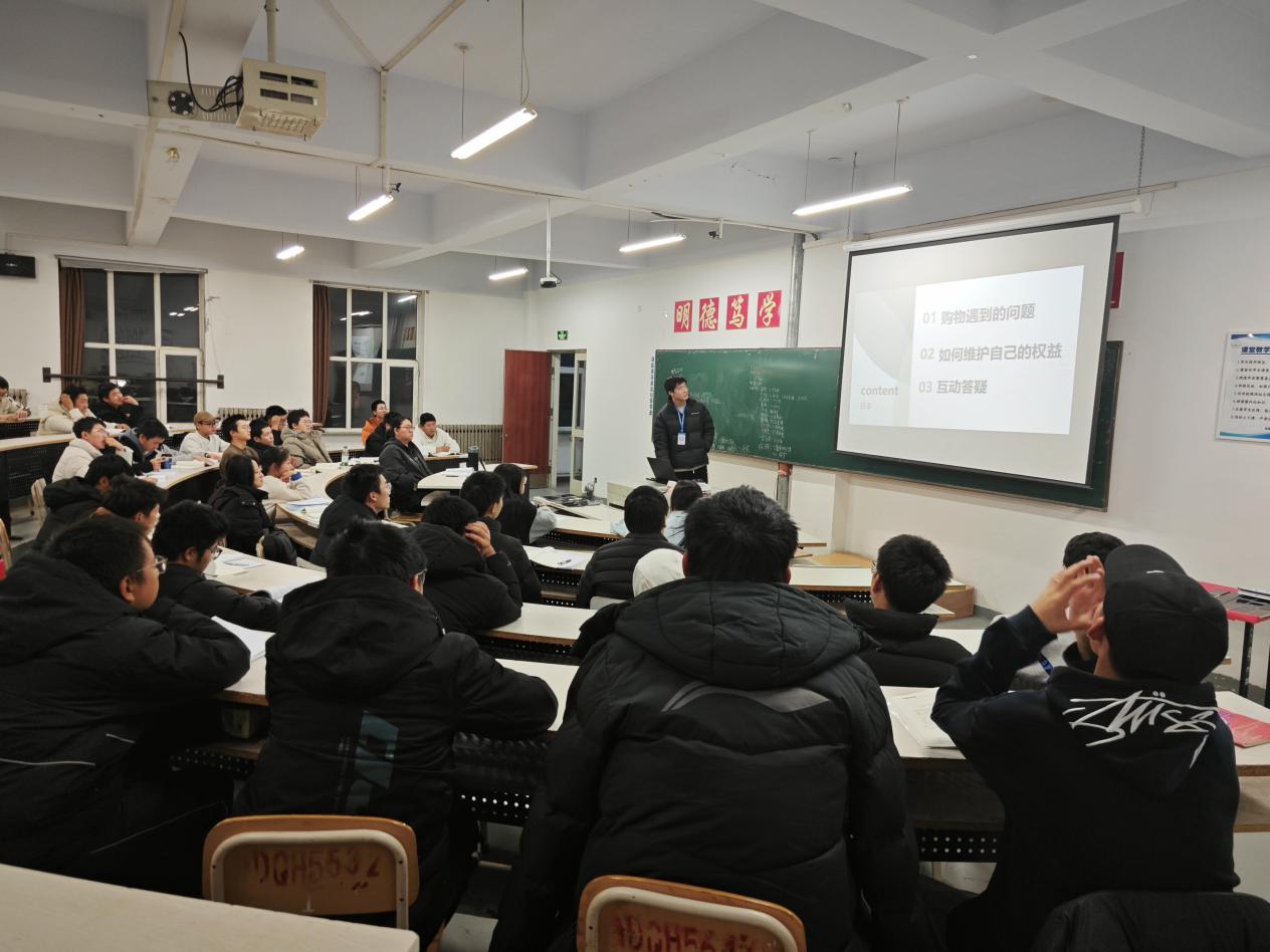 为强化大学生消费风险防范意识,提升依法维权能力,助力营造健康有序的校园消费环境,11月4日晚七点,我院权益保障部于教学楼面向2025级新生举办了以“理性消费,权益护航”为主题的权益保障知识宣讲活动。