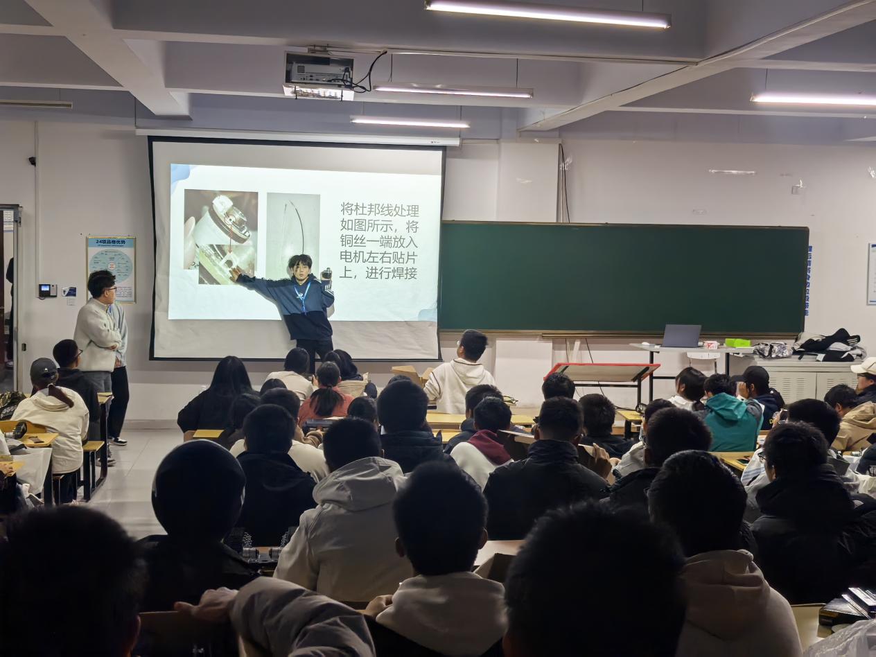 活动中,协会成员通过逻辑清晰的PPT讲解,系统介绍了焊接原理、工具使用规范及安全要点,并结合实操视频,逐步演示电机引脚定位、开关接线与焊点加固等关键步骤,帮助同学们迅速掌握焊接核心要领。主讲人重点强调了焊点质量、防虚焊与用电安全等细节,进一步强化规范意识。