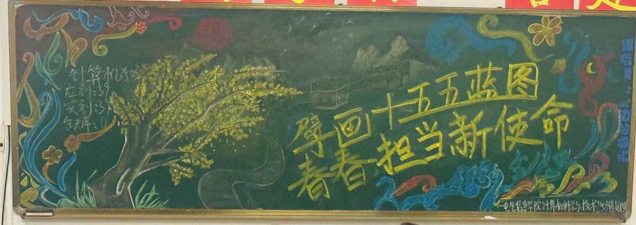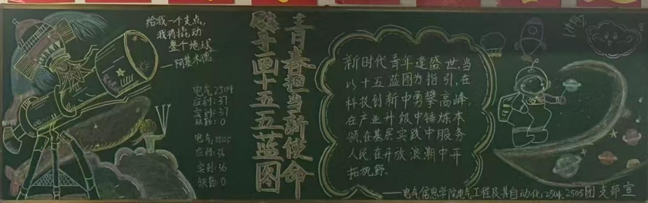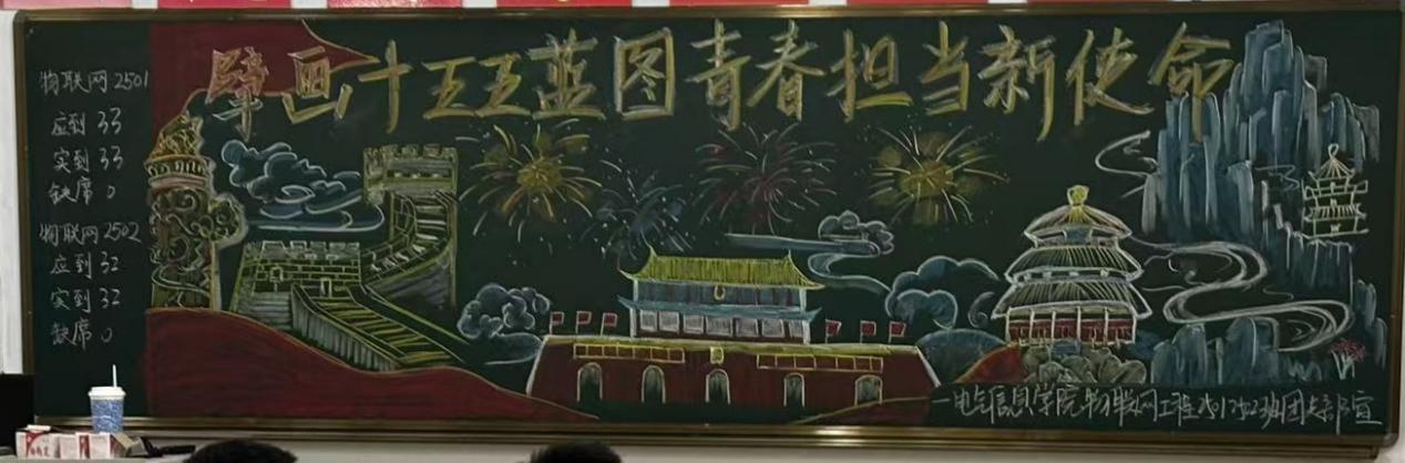 活动期间,各班同学群策群力、创意涌流,以黑板为画布,以色彩为笔墨,将“十五五”规划的发展愿景与青年学子的责任担当深度融合。最终呈现的板报作品主题鲜明、布局精巧、图文呼应、意蕴深厚,生动展现了学子们对时代蓝图的深刻理解与勇担新使命的青春决心。