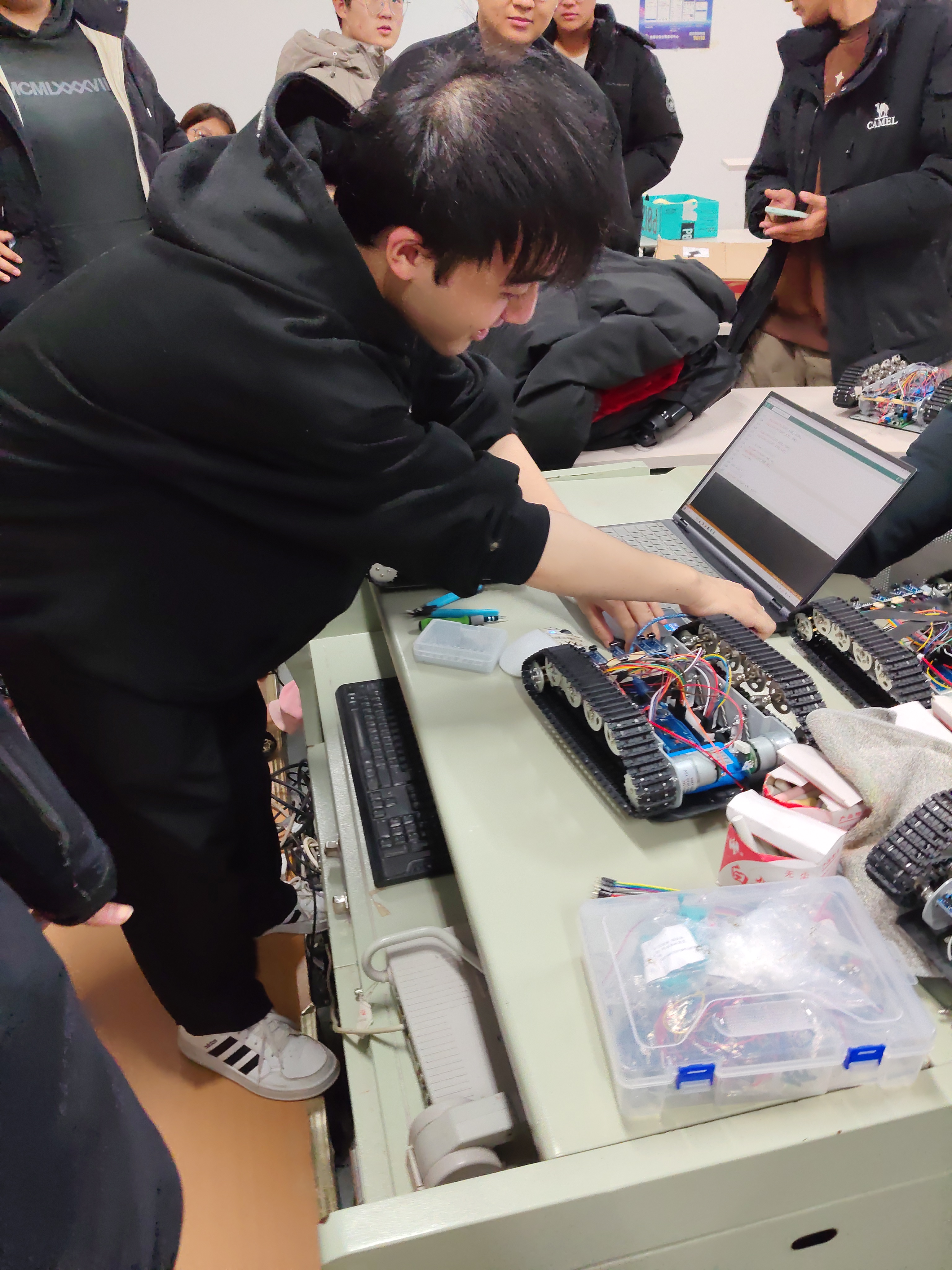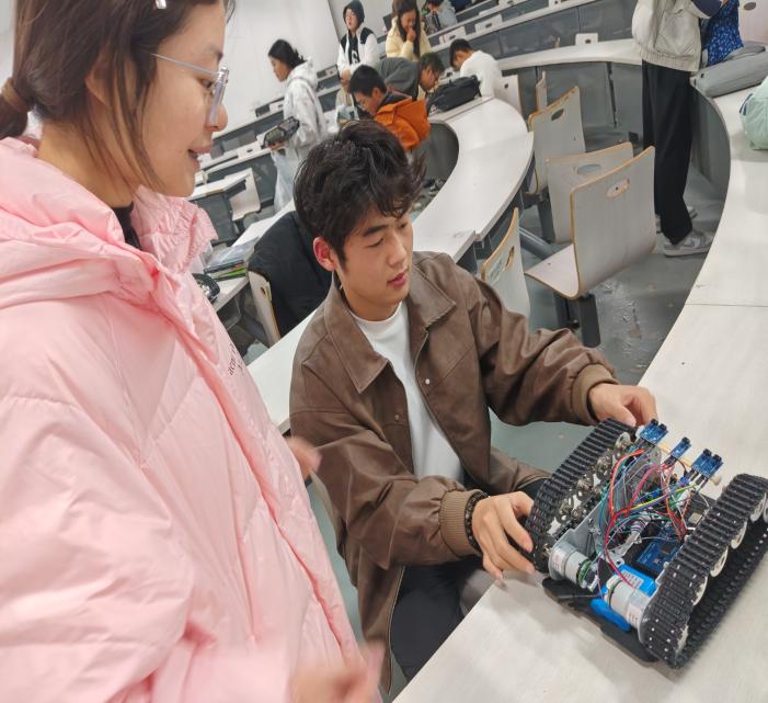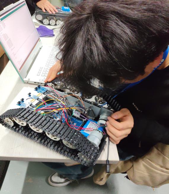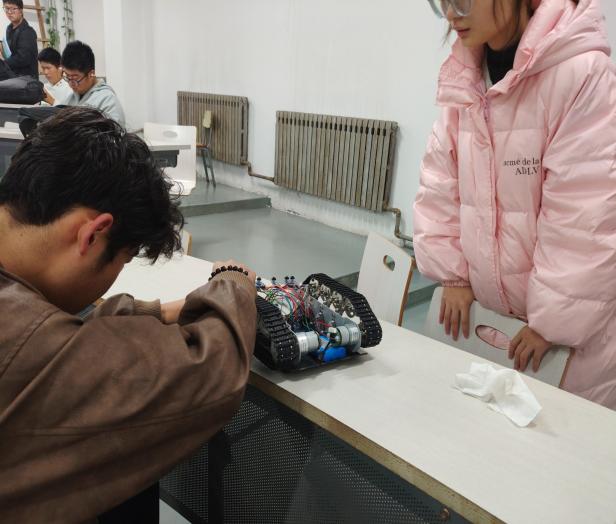 活动伊始,赛创协会成员率先梳理备赛过程中同学们集中反馈的技术痛点,结合经验,联系实际,系统讲解各类问题的排查逻辑与解决思路。随后,成员们深入同学中间,以“一对一”“一对多”结合的辅导方式,直面大家的实际困境:针对履带运动异常、速度不均等硬件问题,现场拆解设备,细致排查电机驱动、履带咬合、电源连接等关键部件,手把手指导同学们调整参数、修复故障;遇到代码调试难题时,耐心剖析代码逻辑,协助修改关键指令,演示调试技巧。