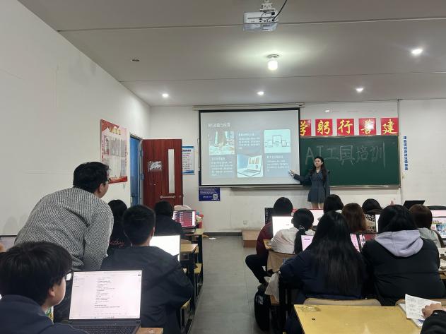活动以理论讲解、实操演示、现场指导、互动答疑的形式展开,分专业、分教室有序进行。培训中,主讲人围绕豆包、WPS、Deepseek、Kimi、可画、堆友、海螺、即梦、可灵、飞书等多款主流AI工具,详细讲解软件功能、使用逻辑与实操技巧,结合课程学习、作业撰写、资料整理、专业研究等真实场景展示应用案例,让同学们清晰掌握AI工具的正确使用方法。